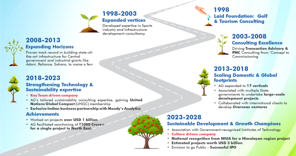 Since our formation in 1998, AG has operated as a Solution provider. Beginning with the Golf & Tourism Industry, and subsequently diversifying into Sustainability, Architecture, IT & Digital and Sports, we continue to deliver positive change and drive innovative performance through our bold and transformative strategies. The 20th year saw the transformation of AG into a new entity “AG Horizon Pvt. Ltd. (AG Group)”. With its leading capabilities, AG continues to offer Sustainable and innovative Consultancy & PMU services towards mega projects across sectors. Our high-performing, multidisciplinary teams deliver innovative, pragmatic, and responsible solutions by helping our clients capitalize on new opportunities. Our corporate philosophy lies in delivering Quality work and Efficient Sustainable Outcomes exceeding client expectations and contributing to the overall success of the project objectives from Concept to Commissioning.